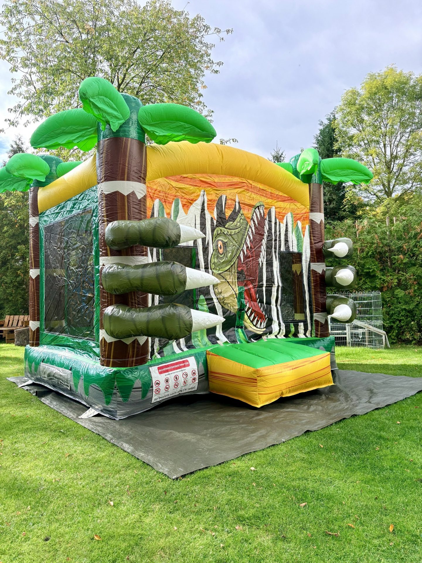 Egal ob Kindergeburtstag, Schulfest oder Firmenfeier, das kräftige Dino Design, die imposanten Farben und der große Hüpfbereich ziehen Kids sofort in den Bann.